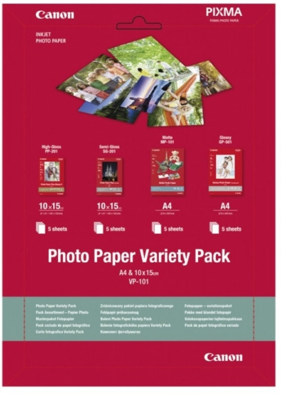 Paper Canon Variety Pack VP-101, A4 (210x297mm) & 4"x6" (102x152mm), Set: Matte MP-101-1pcs (A4 of 5 sheets) & Glossy GP-501-1pcs (A4 of 5 sheets) & High-Gloss PP-201 - 1pcs (10x15cm of 5 sheets) & Semi-Gloss SG-201-1pcs (10x15cm of 5 sheets)