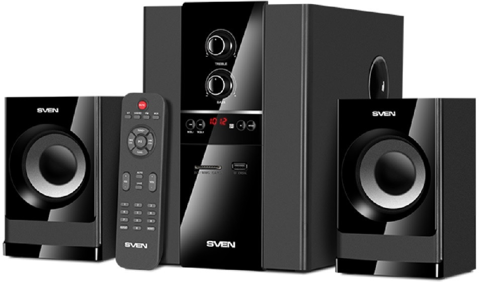 SVEN MS-1821 Black, 2.1 / 20W + 2x12W RMS, FM-tuner, USB & SD card Input, Digital LED display, remote control, all wooden, (sub.3.9" + satl.3.15")