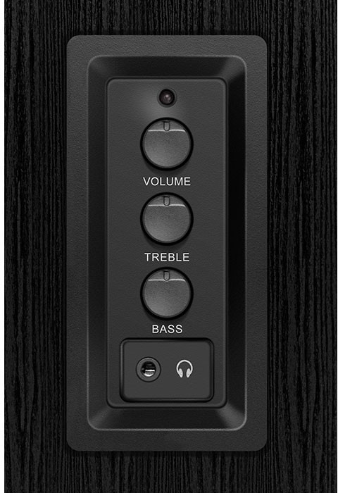 На правую боковую панель акустической системы вынесены удобные, интуитивно понятные органы управления - раздельная регулировка тембра и настройка громкости. Регуляторы работают очень плавно и позволяют производить тонкую настройку акустики по своему вкусу. Также на боковой панели находится разъем для подключения наушников.