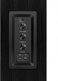 На боковой панели правой колонки расположены органы управления акустикой – регулятор громкости и раздельная регулировка высоких и низких частот. Также здесь находится разъем для подключения проводных наушников.