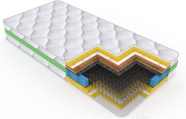 Peste acest strat este aєezatг o placг din fibre de cocos cu densitatea de 130 kg/ m3 єi grosimea de 10 mm. Fibrele de cocos sortate sunt presate .i acoperite de lapte de latex fierbinte. Astfel rezultг un material foarte elastic .i dur, .i оn acela.i timp foarte rezistent.Materialul exterior este compus din 4 straturi, matlasat complet din Bumbac 80% si Polyester 20%, оmpreuna cu un strat de vatelinг de 150g/ m2, si un strat de spuma poliuretanica cu densitate de 18kg/ m3, cu grosime de 10 mm si TNT 15g/ m2.