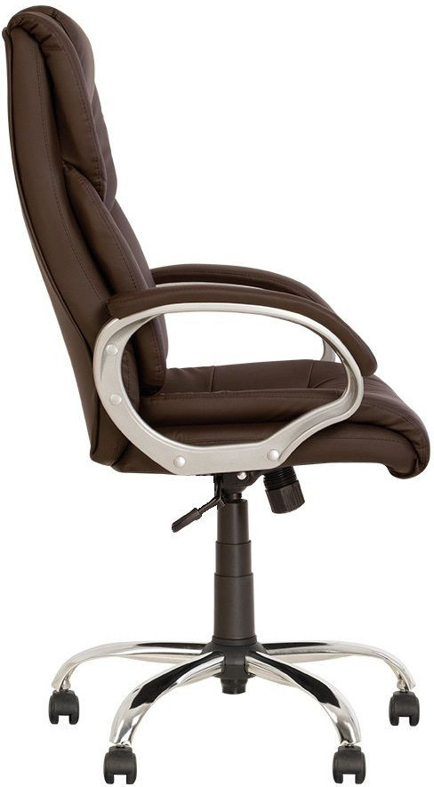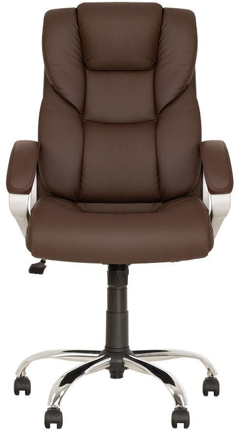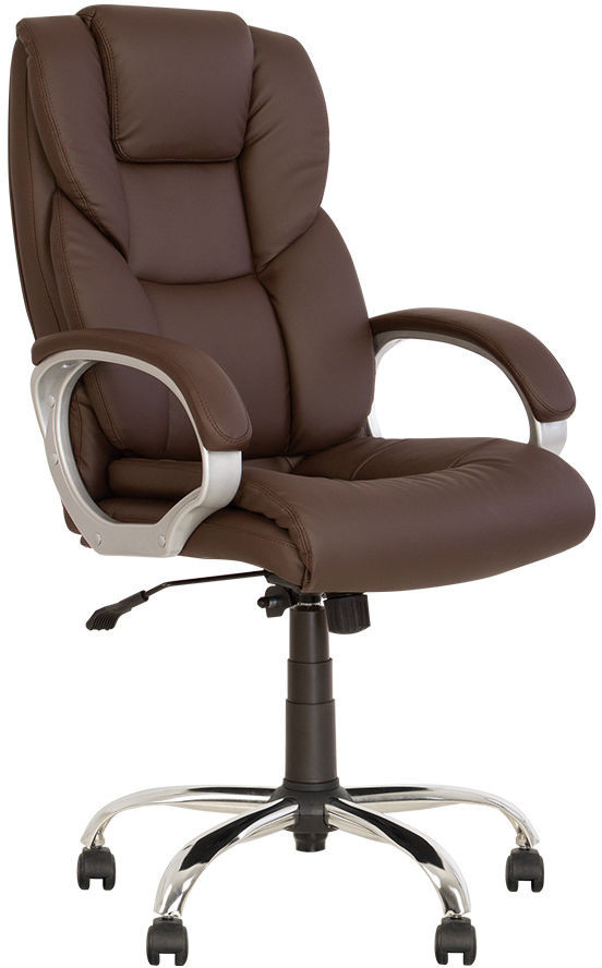 Комфортабельное кресло для руководителя с обивкой из экокожи темно-коричневого цвета. Комфортная эргономика, достигаемая поролоновыми вставками чехла и профильной спинкой, "неплоский" (пухлый) внешний вид кресла в сочетании с оптимальной ценой.Пластиковые подлокотники с мягкими накладками, хромированная крестовина. Установлен механизм качания TILT. Максимальная допустимая нагрузка 130 кг.