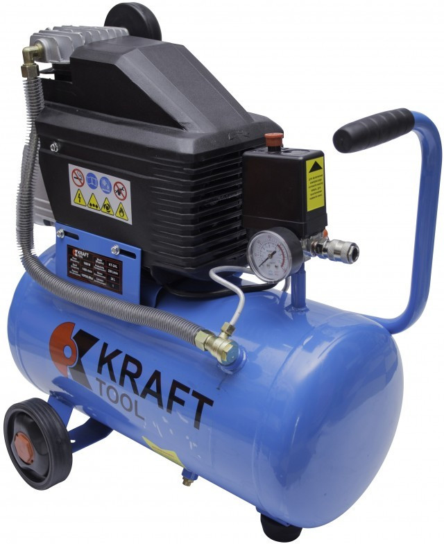 Описание KRAFT TOOL KT24L КОМПРЕССОР KRAFT TOOL Напряжение: 220 В ~ 50 Гц Мощность: 1600 Вт Водоизмещение: 230 л/мин Скорость: 1400/мин Танк: 24 л Давление: 0.8 MPa Количество цилиндров: 1