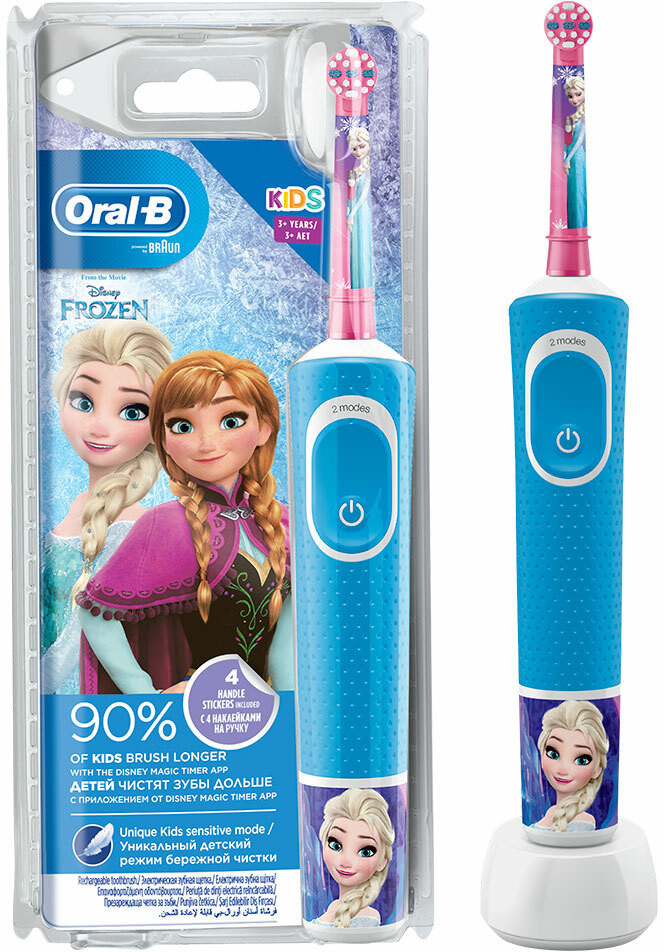 Electric toothbrush Oral-B Kids for ages 3+ with four Frozen-themed stickers. Round brush head sized for small mouths and rechargeable battery for an 8-day charge. red