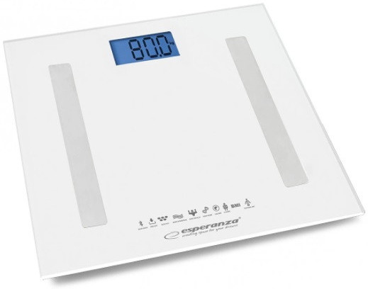 Bluetooth Scale Esperanza 8in1 EBS016W White, measurement: body weight [kg], body fat content [%], water content in the body [%], muscle weight [kg], bone weight [kg], visceral fat index, body mass index (BMI), identification of the optimal calorie inta