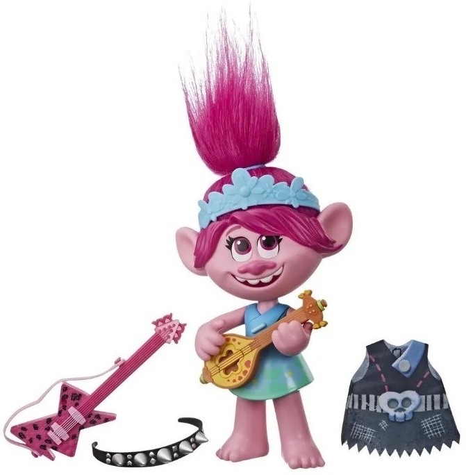 Trolls 2 "Поющая Розочка" Музыкальная игрушка Розочка из нового мультфильма «Тролли: Мировой тур» в 2-х стильных образах – поп и рок. Куколка с яркими мягкими малиновыми волосами и отлично детализированным лицом может быть одета в стиле рок-н-ролл или хард-рок. У нее есть 2 музыкальных инструмента – укулеле и электрогитара, которые вставляются в руки, и возможность исполнять версию песни Trolls Just Want to Have Fun из мультфильма в двух музыкальных версиях. Для работы игрушки нужно нажать кнопку на туловище. Высота куклы: 33 см Тип батареек: 2 ААА (включены) Рекомендуемый возраст: 4 года +